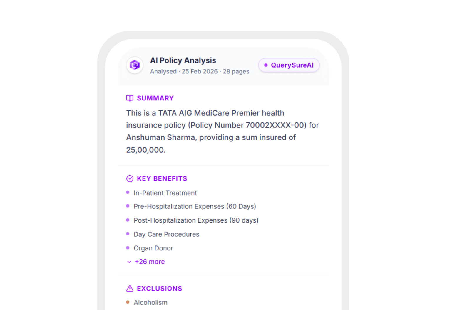 QuerySure reads policy documents, extracts key details, and answers your questions — all from a single upload.